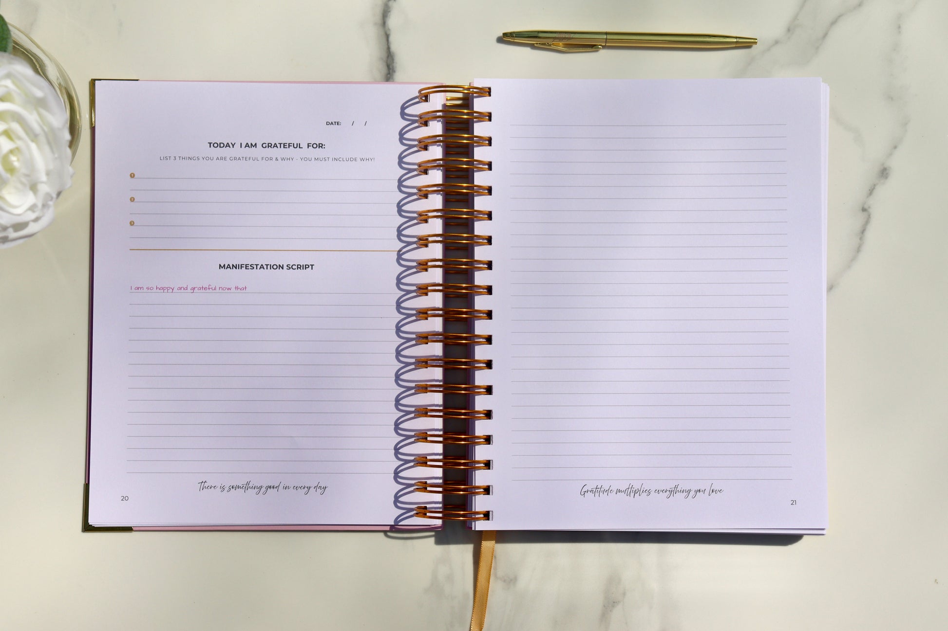 The Gratitude is Yummy™ Journal is a structured, beautifully crafted daily journal designed to shift your mindset in minutes through the signature 5-10 minute daily Gratitude → Scripting → Activation flow.